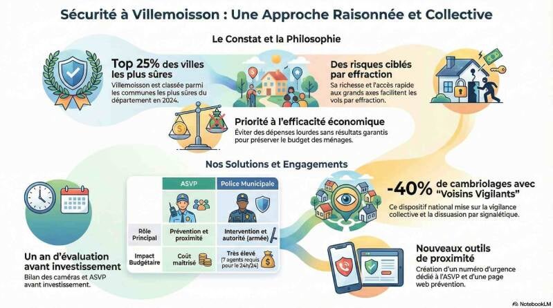 Villemoisson est classée dans le quart des communes les plus sûres de l'Essonne (données 2024 de la police), mais est la cible de vols par effraction du fait de sa richesse relative et de son accès rapide aux grands axes routiers. Le sentiment d'insécurité grandit aussi à cause des incivilités et de l'individualisme qui isole les habitants. Il est urgent de rompre cet isolement, de faire de la prévention et de garantir la tranquillité avec connaissance et bon sens.